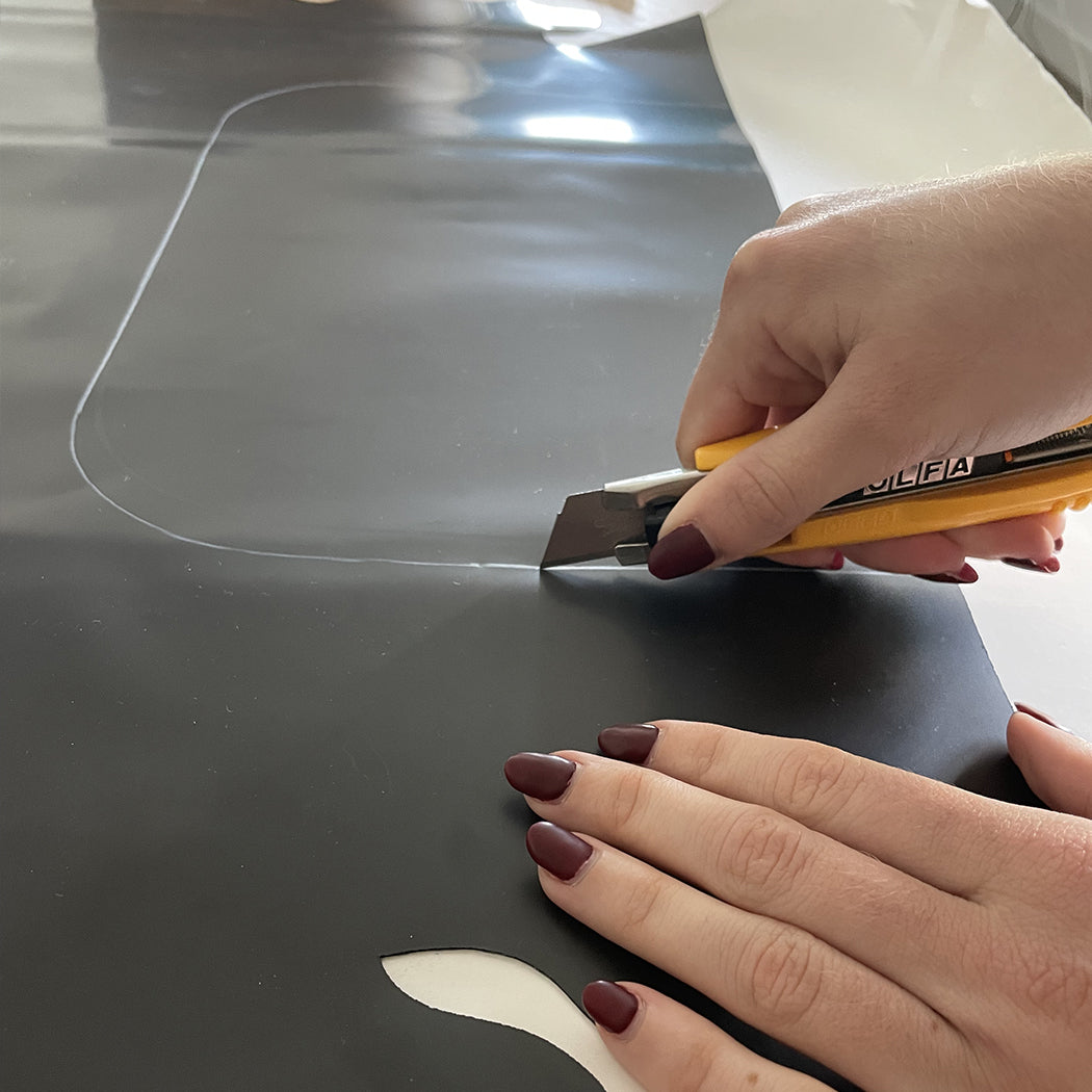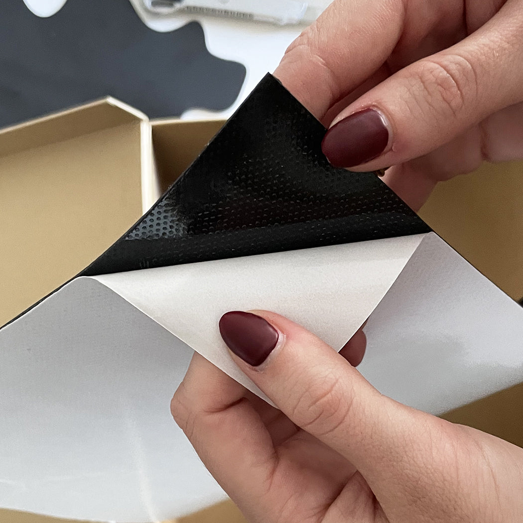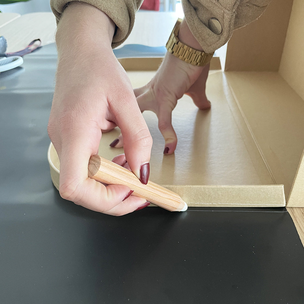 Ensuite, décollez la pellicule qui protège l’adhésif du tableau et appliquez-le à l’intérieur de la valisette.