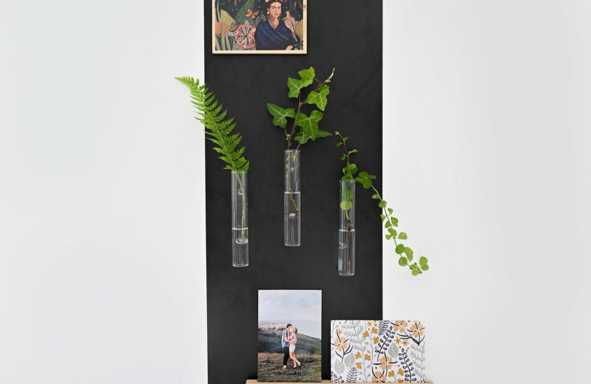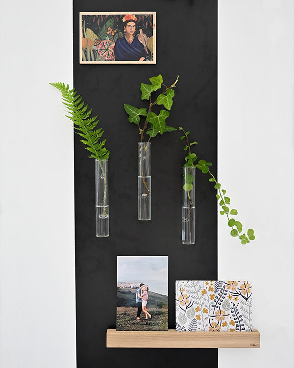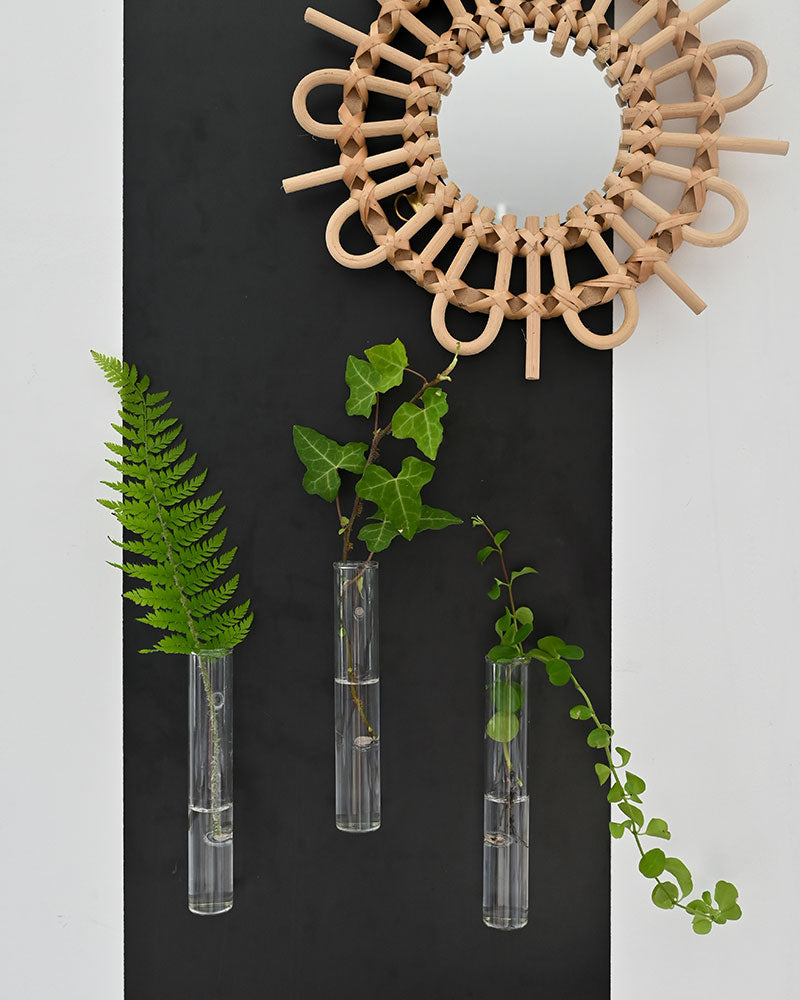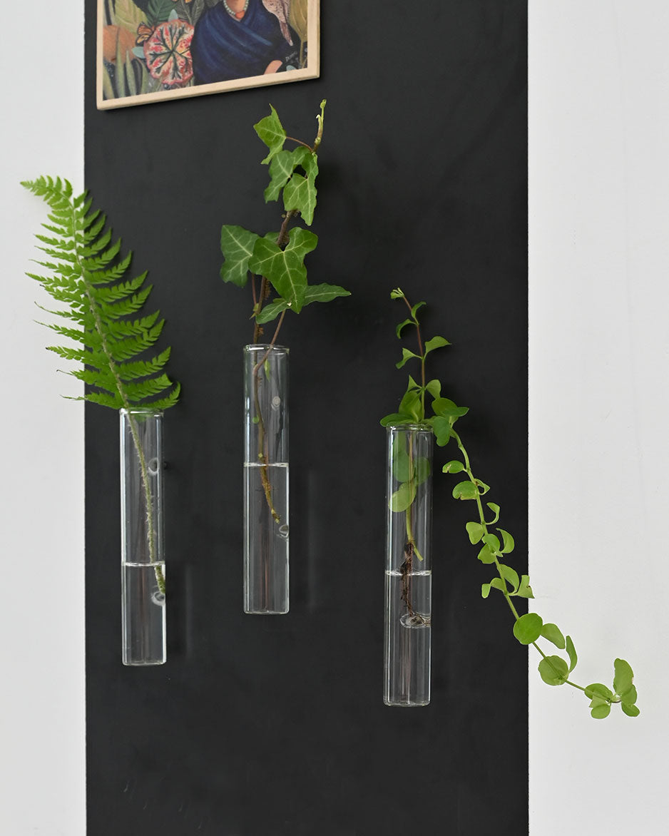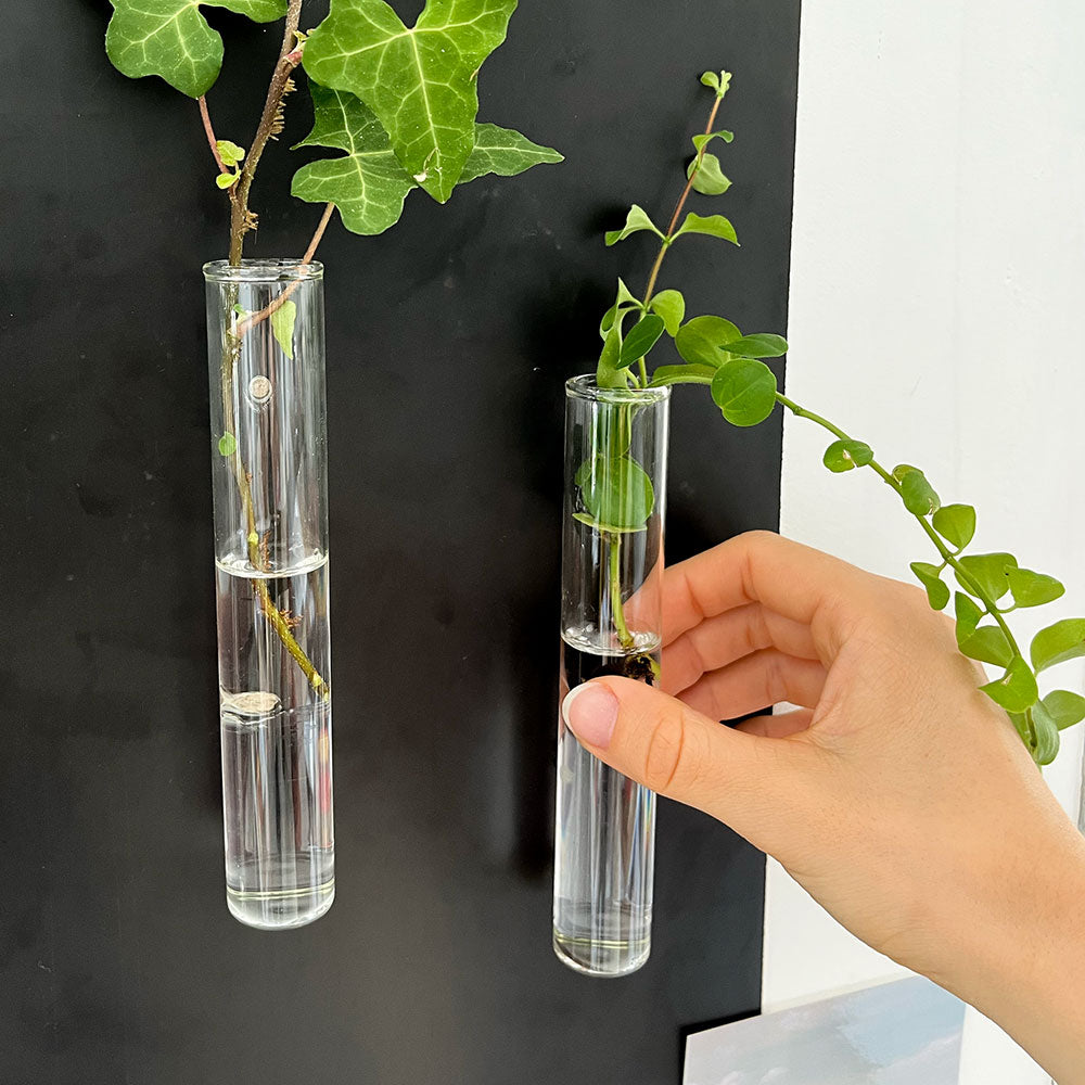 Reagenzgläser erfreuen sich seit einiger Zeit großer Beliebtheit. Diese kleine transparente Glasröhre hat den Vorteil, dass sie diskret ist und sich gut an alle Innenräume anpasst. Es ist das perfekte Element, um eine magnetische grüne Wand zu schaffen!