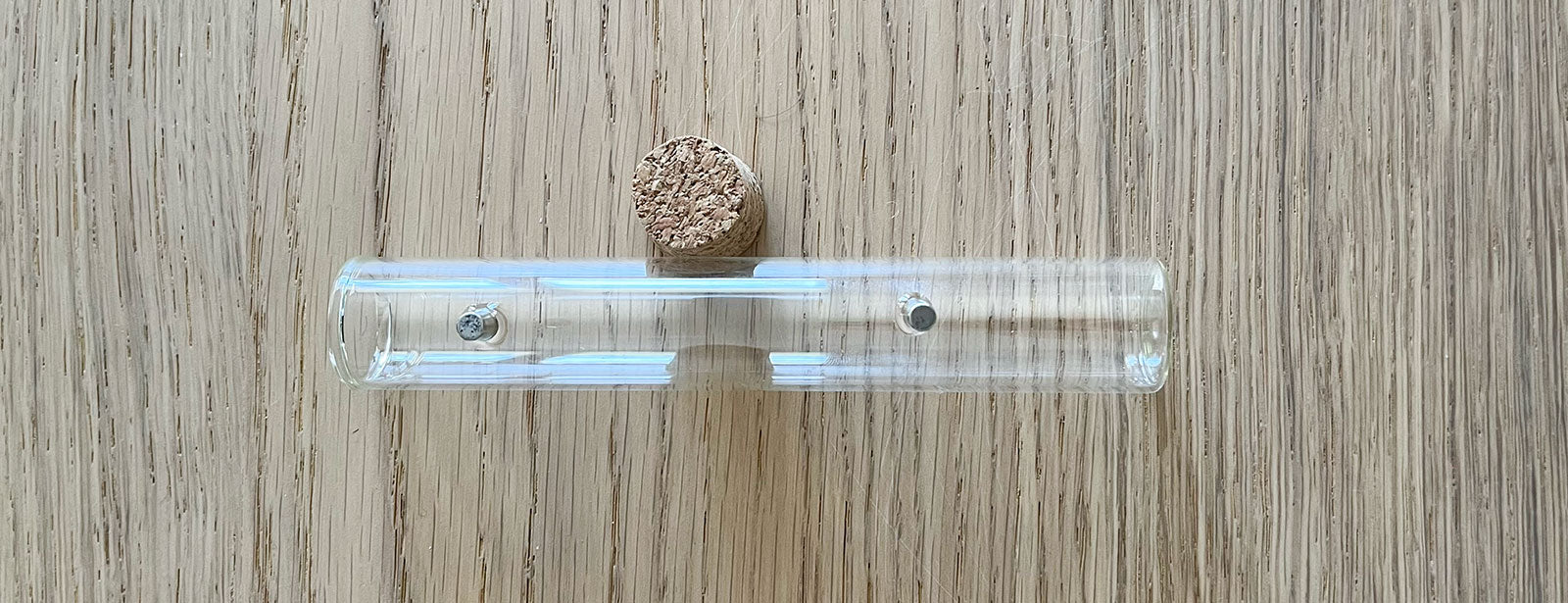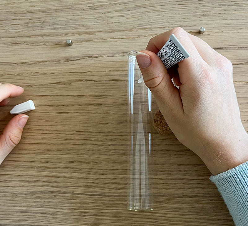 Tragen Sie einen Klebepunkt auf den oberen Teil Ihres Reagenzglases auf und positionieren Sie Ihren kleinen Magneten schnell auf diesem Klebepunkt.