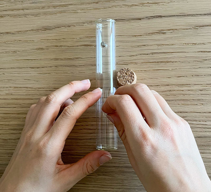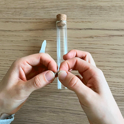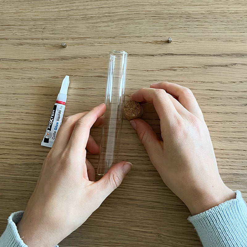 Reinigen Sie zunächst Ihre Reagenzgläser gründlich mit einem sauberen Tuch und etwas Wasser. Nehmen Sie dann eine Tube und stellen Sie sie vor sich hin. Um die nächsten Schritte dieses DIY richtig durchführen zu können, müssen Sie Ihr Rohr richtig abstützen, damit es nicht auf dem Tisch rollt. Sie können zum Beispiel Fixierpaste verwenden oder wie wir den Tubenverschluss nutzen.