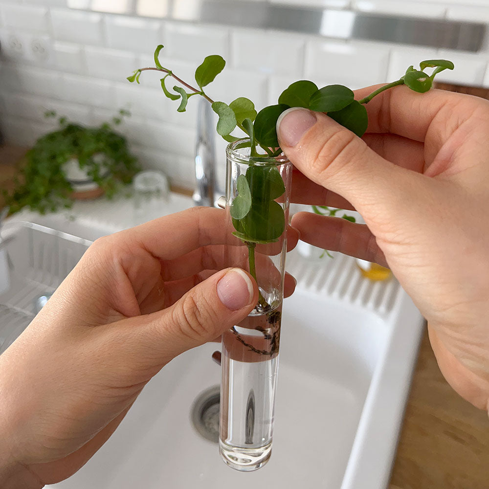 Wenn Ihre kleinen Vasen fertig sind, können Sie etwas Wasser hineingießen und Ihren Pflanzensteckling hinzufügen.