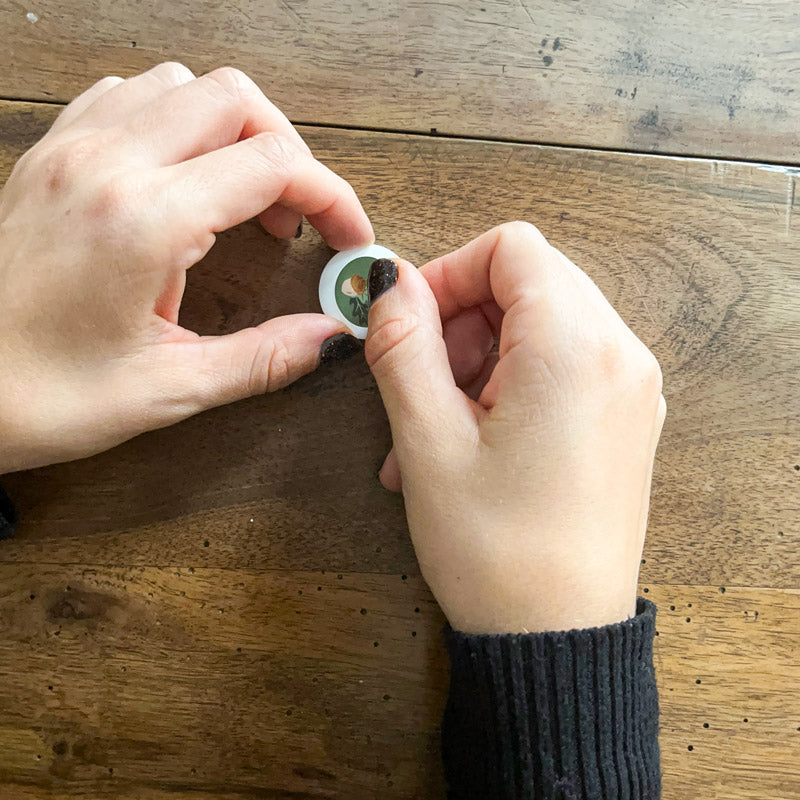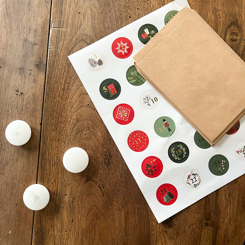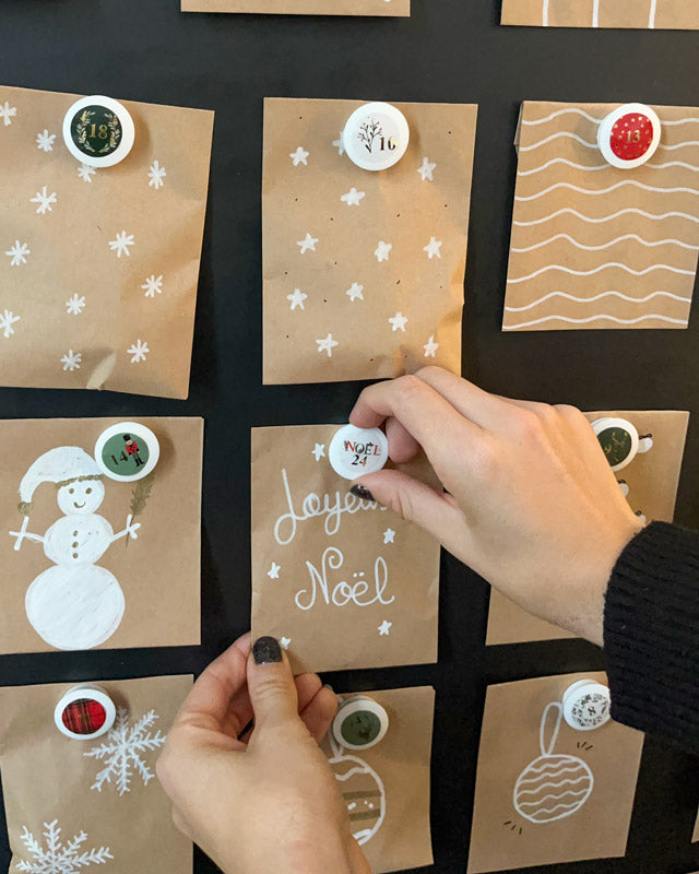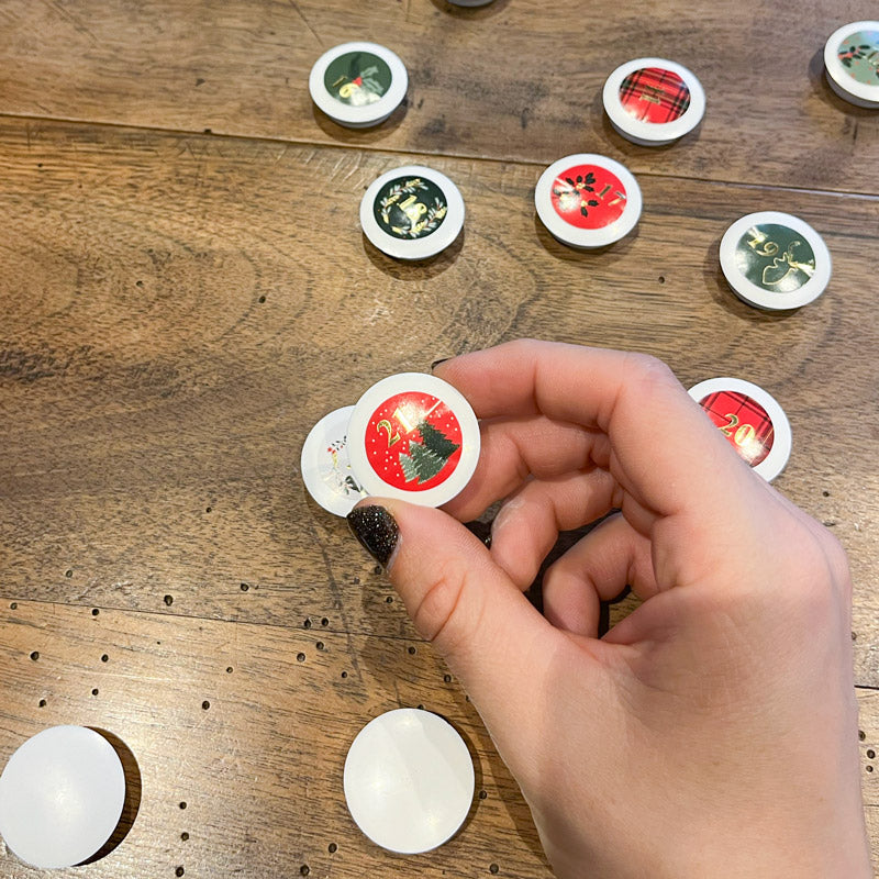 Bevor Sie Ihren Kalender zusammenstellen, personalisieren Sie die runden Magnete von Ferflex. Schreiben Sie mit einem goldenen Marker oder Aufklebern die Zahlen von 1 bis 24 auf jeden Magneten, die den Dezembertagen entsprechen.