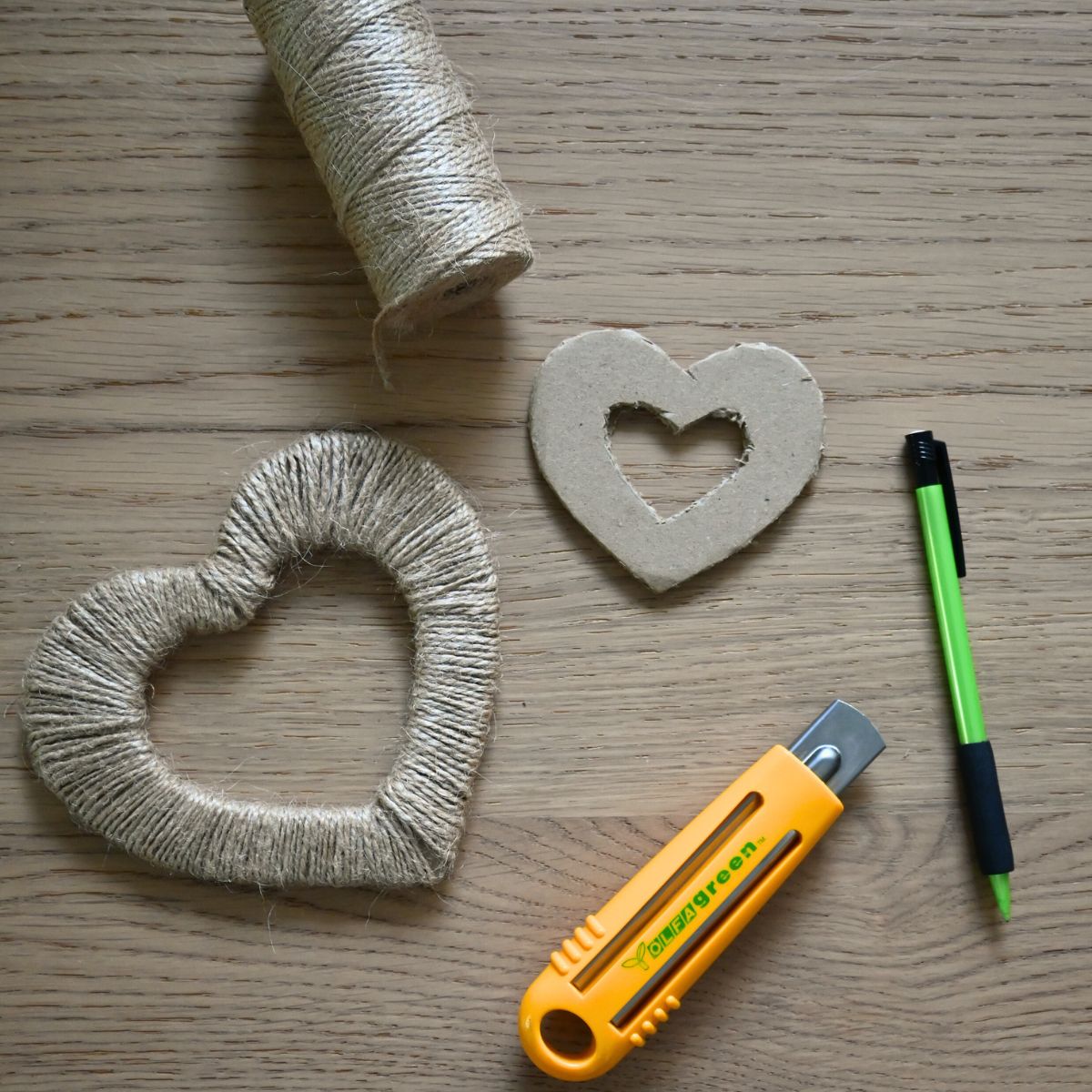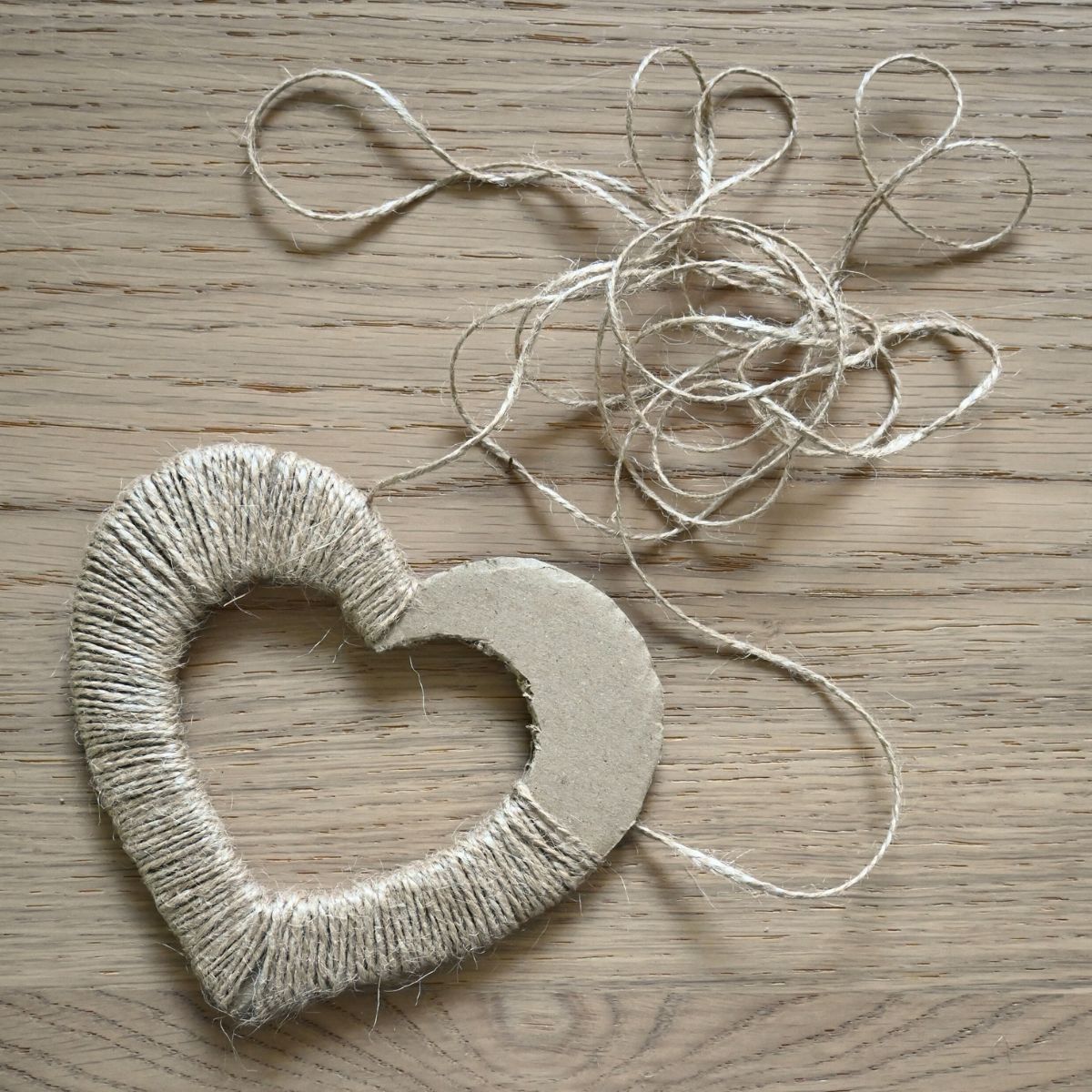 Découpez maintenant un bout de la ficelle de jute et commencez à enrouler la forme de manière à ce que la ficelle soit bien serrée autour du carton.