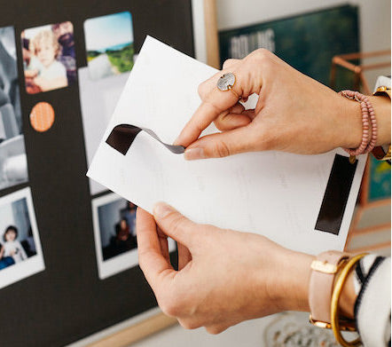 Avant de positionner vos éléments sur votre papier peint magnétique, collez un morceau de rouleau adhésif aimanté au dos de vos photos, affiches.