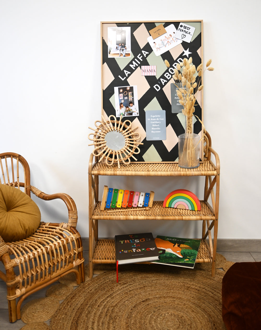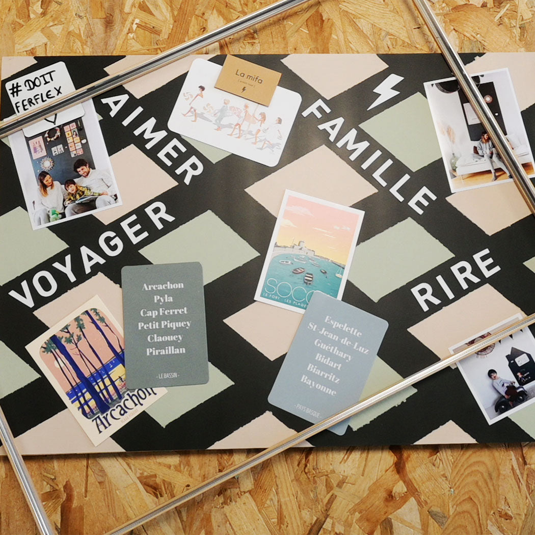 Décorez votre tableau magnétique à votre guise. Magnets, photos, cartes postalesmoodboard… Les possibilités sont infinies.