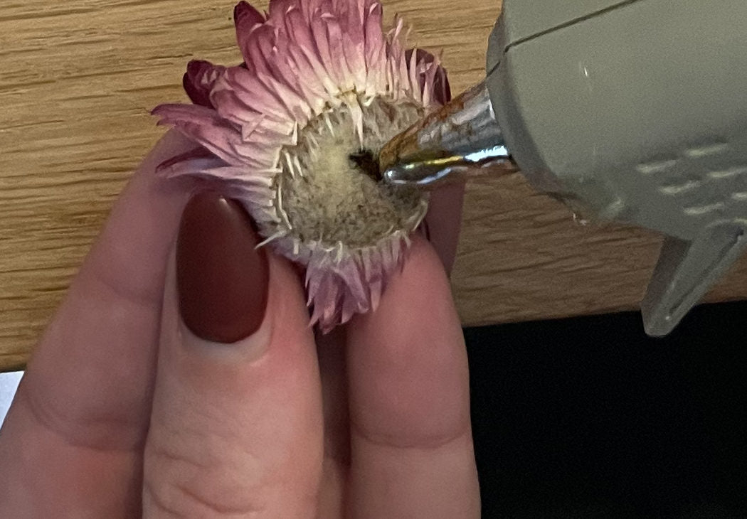 Um das etwas zu auffällige Floratape zu verbergen, haben wir drei Trockenblumen aufgeklebt, um einen noch floraleren Look zu erzielen.