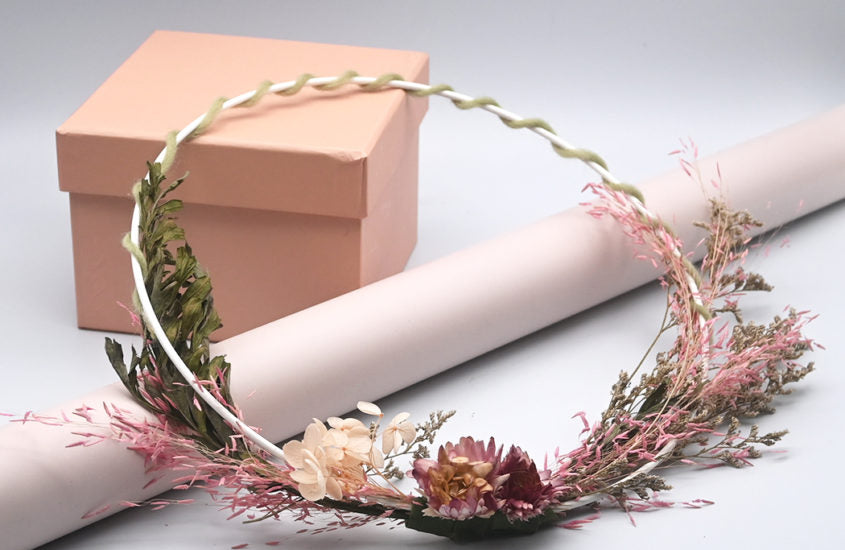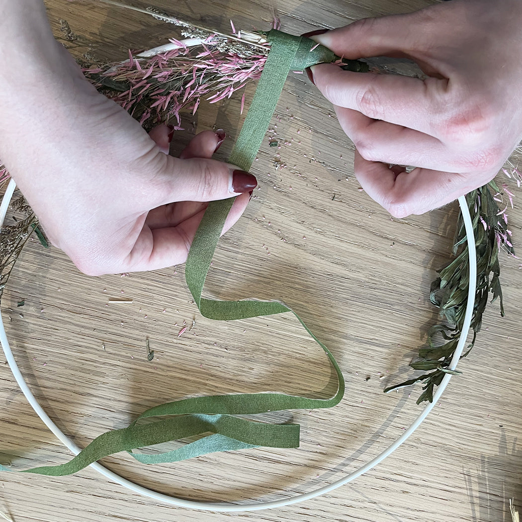 In diesem Schritt wickeln Sie Ihren getrockneten Blumenzweig mit dem Floratape ein und ziehen es fest an. Um alles fertigzustellen, geben Sie einen Punkt Kleber auf das Ende des Floratape. Sie können dies auf dem Eisenkreis oder einfach auf zwei Seiten tun, wie wir es getan haben.
