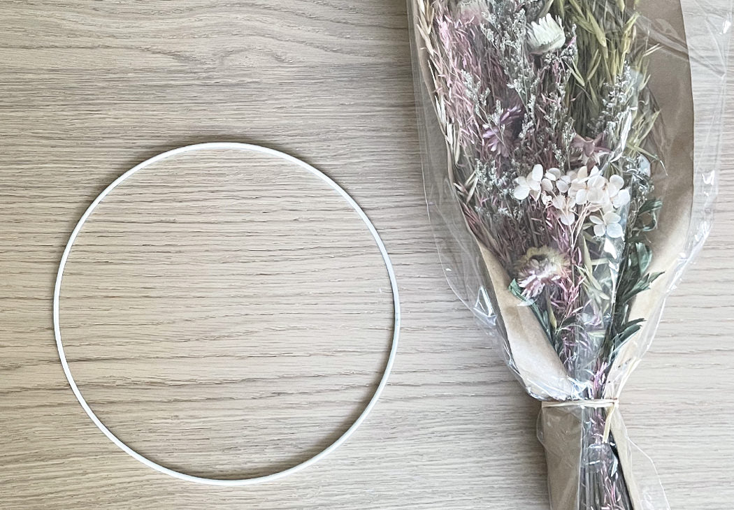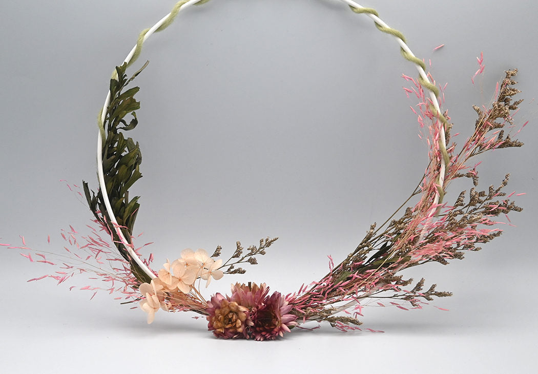 Stellen Sie zunächst Ihren Trockenblumenzweig nach Ihren Wünschen zusammen. Schneiden Sie dann alle zu langen Blütenstiele ab. Für diesen Kranz haben wir rosa Trockenblumen ausgewählt, um den Muttertag zu feiern.