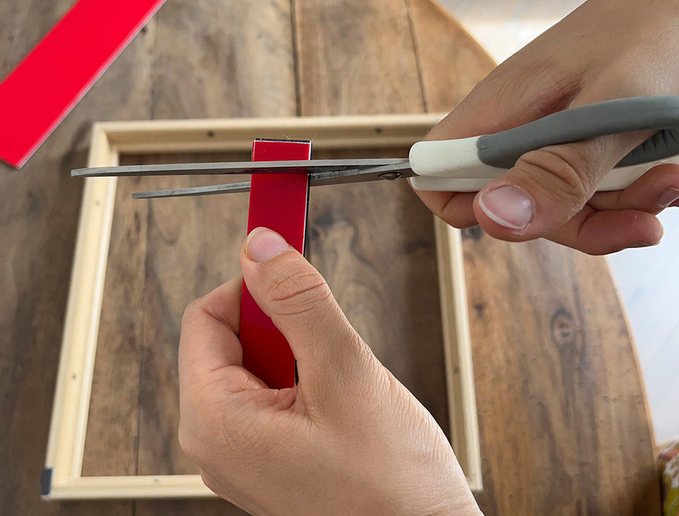 Behalten Sie nur die Umrisse des Rahmens bei und verwenden Sie selbstklebende Magnetstreifen, die Sie in Stücke schneiden, die an die Größe Ihres Rahmens angepasst sind. Kleben Sie diese Teile rund um den Rahmen.