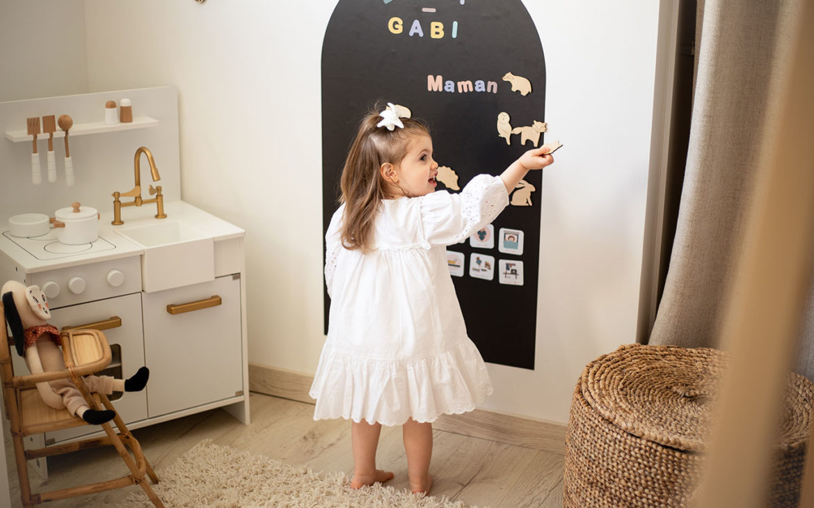 Au réveil et avant chaque coucher, Ella adore utiliser les routines sur son papier peint magnétique. Les jeux sont également éducatifs, elle se servira des lettres magnétiques quand elle commencera à écrire.