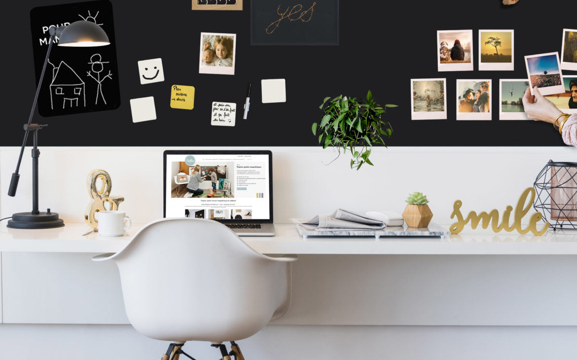 Le support idéal est le papier peint magnétique. Une fois fixé sur votre mur, vous pourrez aimanter tout ce que vous souhaitez ! Tous types d’aimants peuvent y être déposés : photos, cadres, plantes aimantées, rien ne résiste au papier peint magnétique. Très facile à poser grâce à son adhésif, il ne vous faudra que quelques minutes pour le fixer ! La seule limite ? Votre imagination.