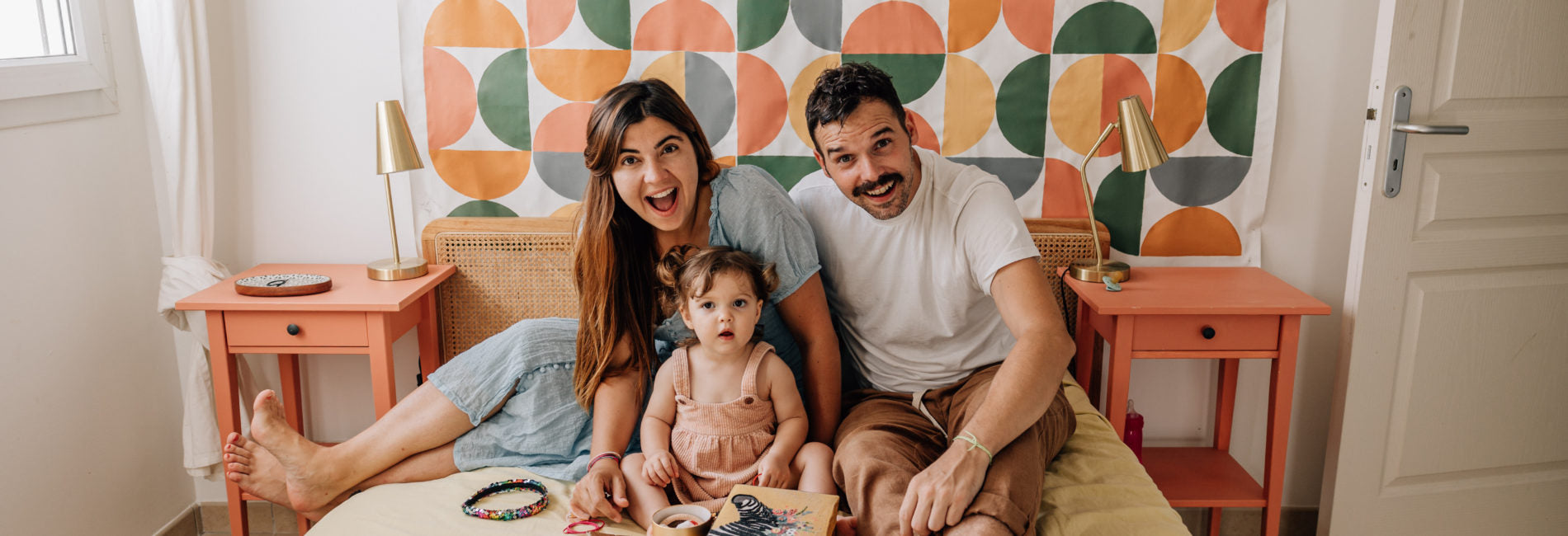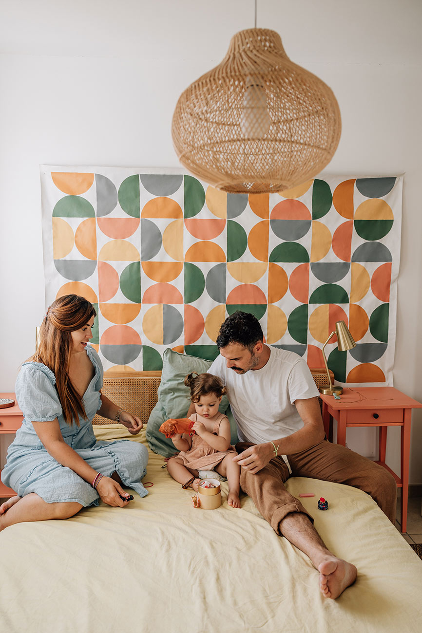 Créer sa déco soi-même ! Pendant la covid, nous avons créé une immense toile, qu’on a peinte. Nous avons cherché des motifs 70s très colorés et nous l’avons accrochée derrière la tête de lit. Ça change tout dans la chambre ! Nous avons fait une photo de famille devant, d’ailleurs !